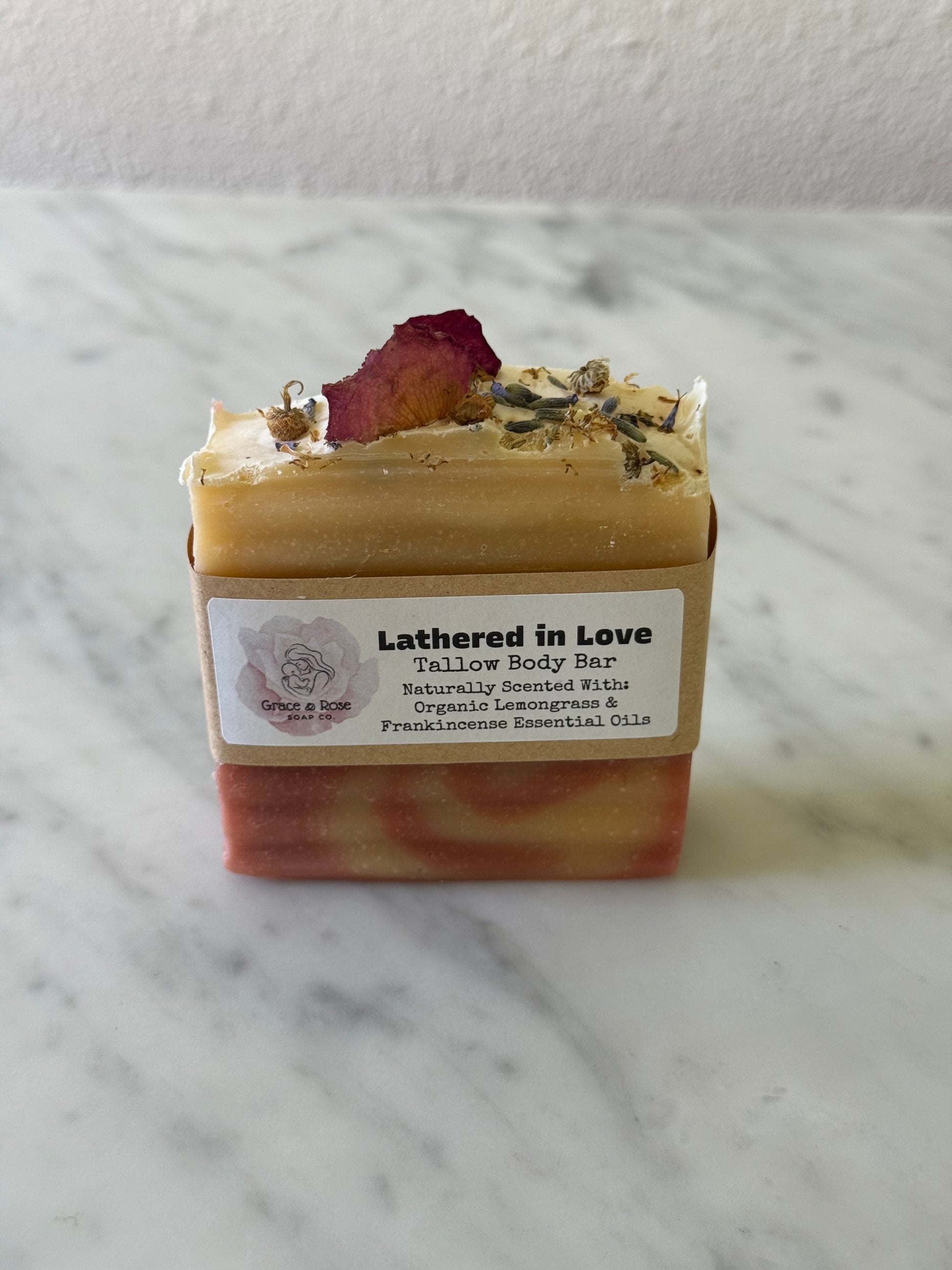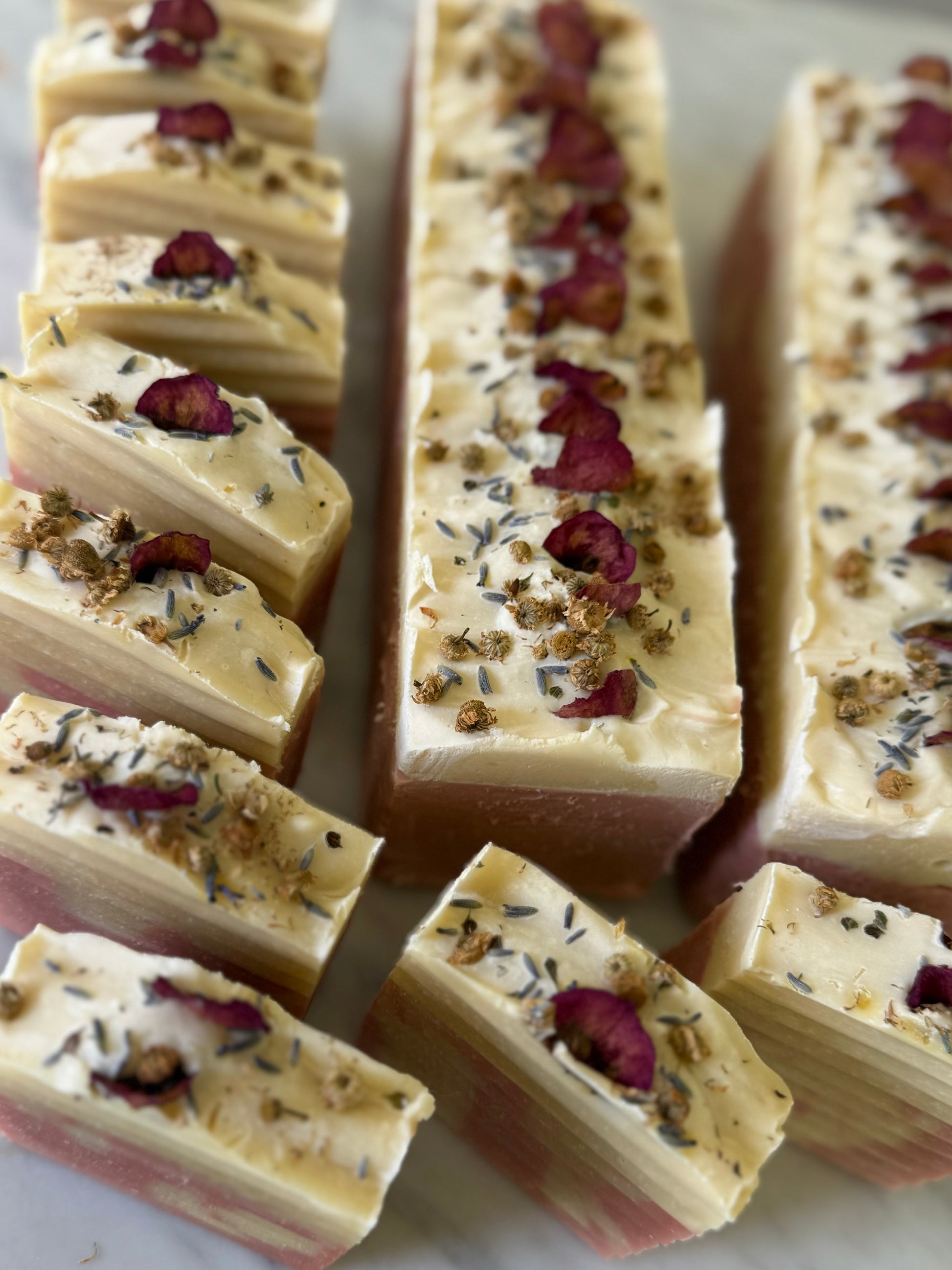 Ingredients: Olive Oil*, Grass-fed Tallow, Coconut Oil*, Lye, Filtered Well Water, Lemongrass Essential Oil*, Frankincense Essential Oil*, Pink Kaolin Clay, Homegrown Dried Flowers*